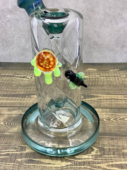 9" Drip My Honey Clear W/ Blue Trim, 3D Bumble Bee & Honey Drips Glass Water Pipe W/ Non-removable Bowl & Stem Heavy Duty Glass