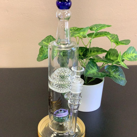 16" Purple All Seeing Eye Clear W/ Yellow & Blue Trim Glass Water Pipe W/ Percolator, Honeycomb & Bowl